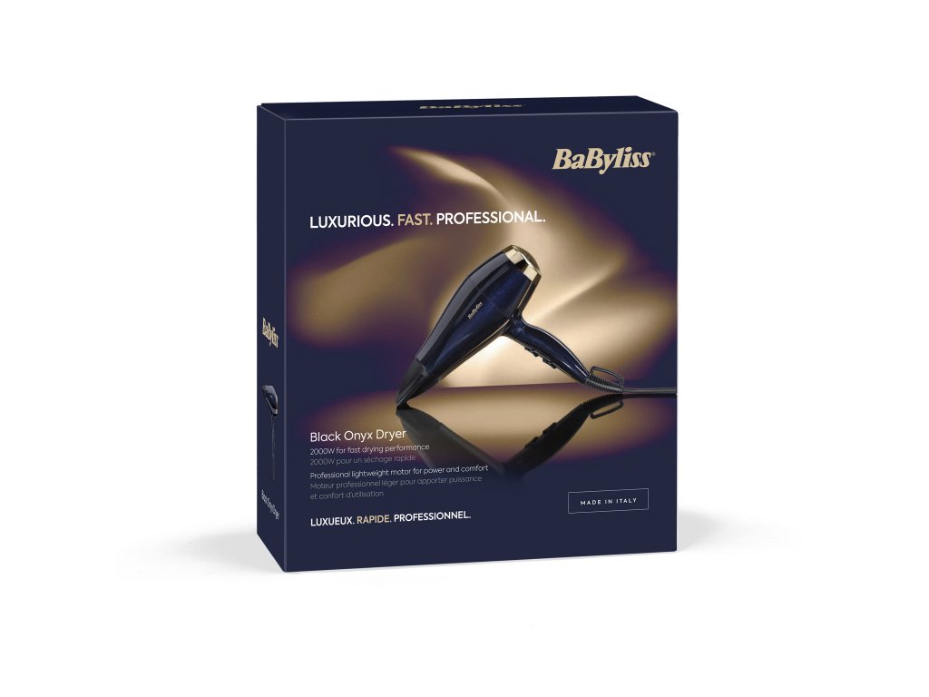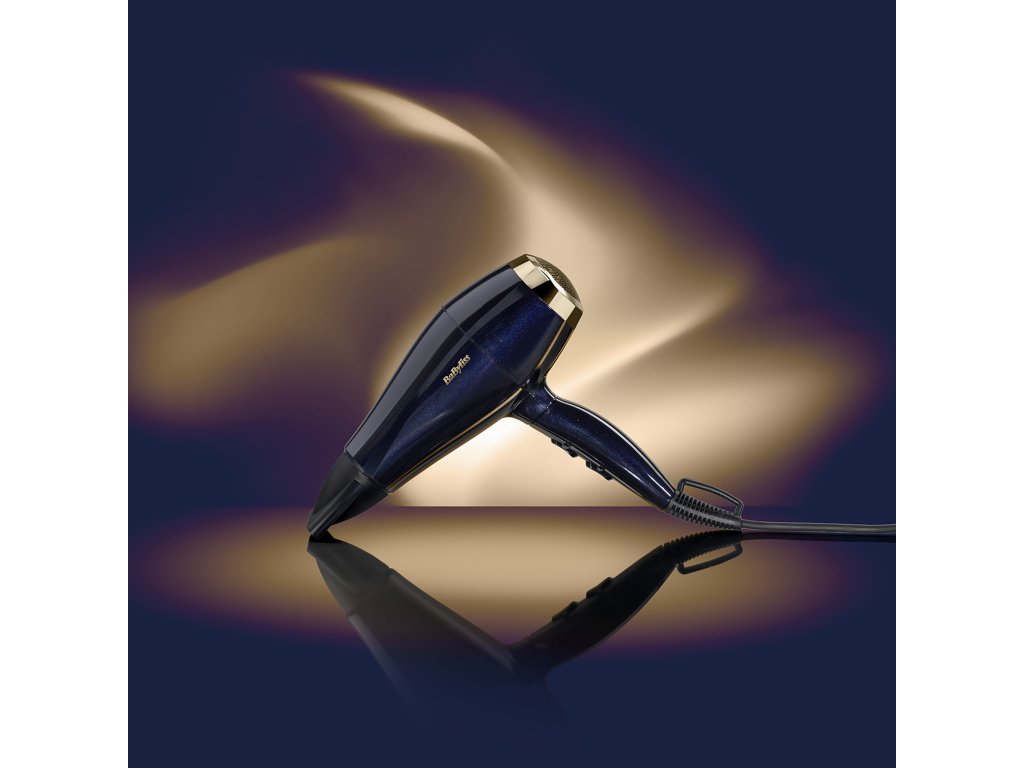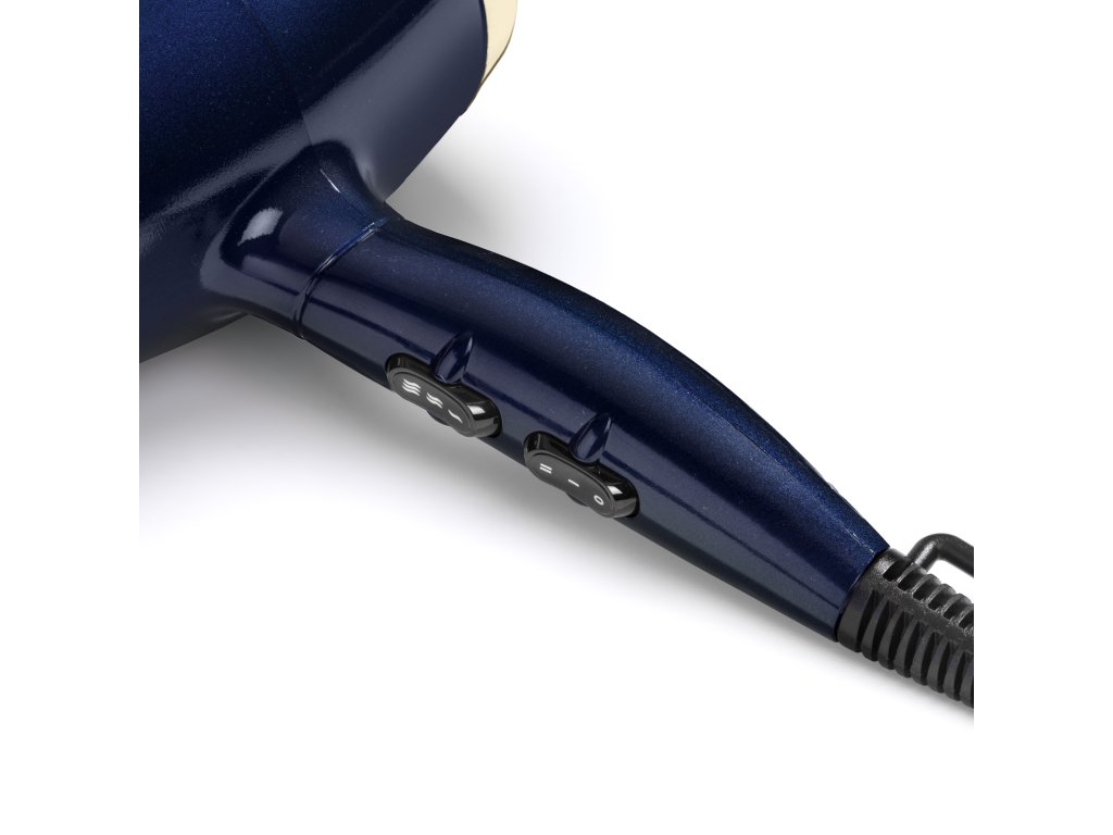 Luxusní fén v barevné kombinaci temně modré a zlaté. S příkonem 2000 W a super DC motorem pro vysoký výkon, rychlostí proudění vzduchu až 95 km/h, lehkou konstrukcí, 3 teplotami, 2 rychlostmi a koncentrátorem v balení. Vyroben v Itálii.