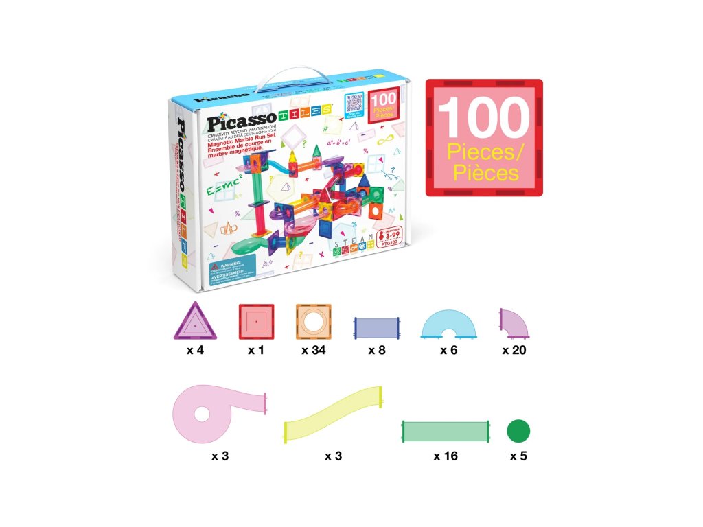 Obsahuje barevné průhledné magnetické dlaždice, rampy a trubice.Umožňuje stavbu 3D kuličkových drah. Děti mohou vytvářet vlastní závodní tratě a sledovat, jak kuličky projíždějí zatáčkami a pády.