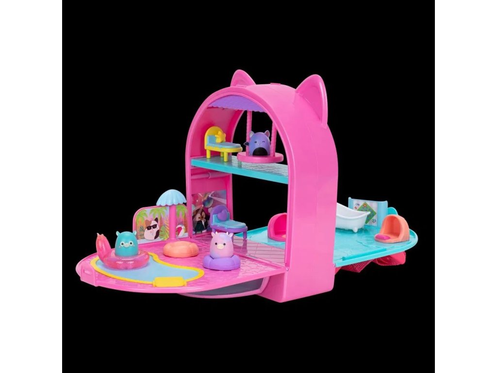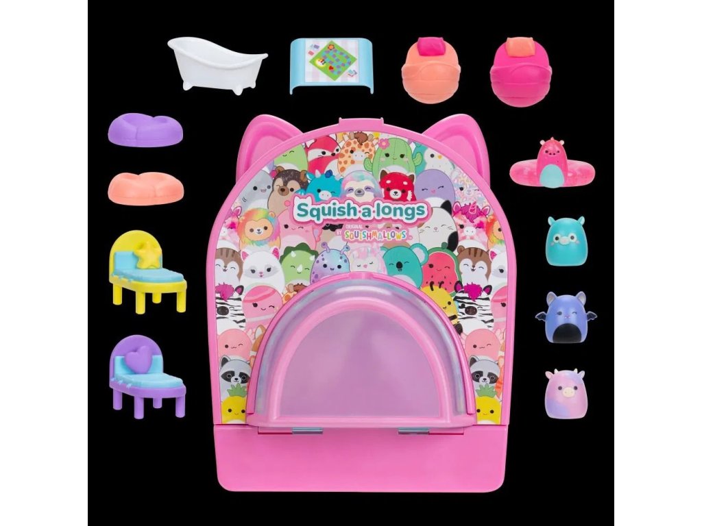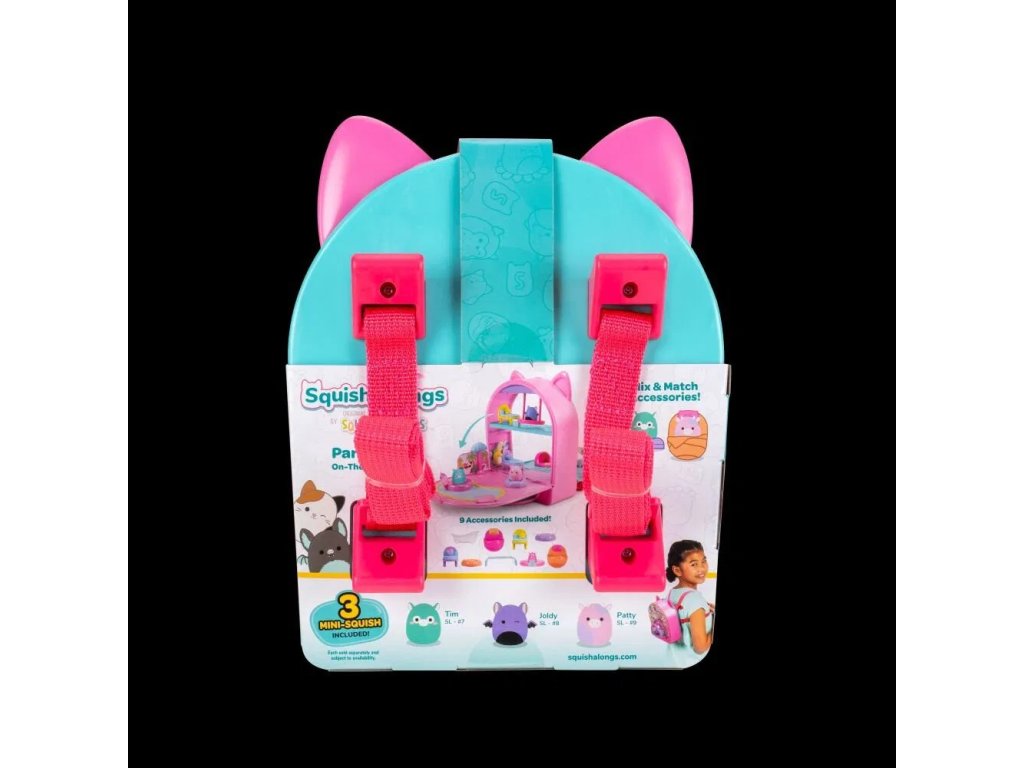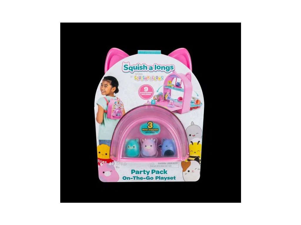 Představujeme Squish-a-longs, vaše oblíbené Squishmallows ve zcela nové velikosti 2,5 cm! Mini-Squish jsou velmi sběratelské, přeměňují se na zázraky, které můžete nosit a jsou ideální na cesty. Hrací sada Party Pack On-the-Go je batoh s nastavitelnými popruhy a přední úložnou kapsou, který se promění v úžasné místo na párty