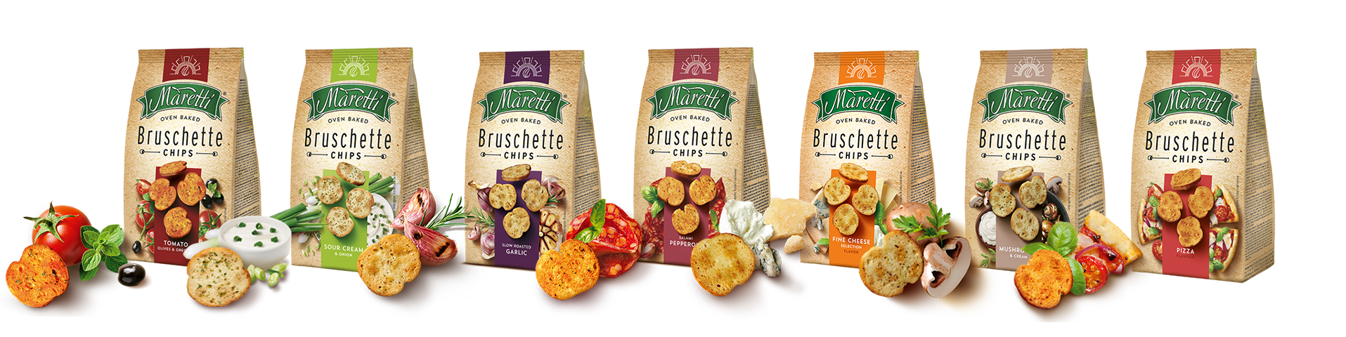 Bruschette Maretti připravujeme v našem tradičním stylu bruschetty. Maretti jsou bohatě okořeněné pouze z jedné strany a nabízejí vám svačinu 2 v 1 s možností výběru intenzivní a jemné chuti (méně koření pro jemnou chuť nebo více koření pro intenzivní). Ať tak či onak, nebudete litovat.